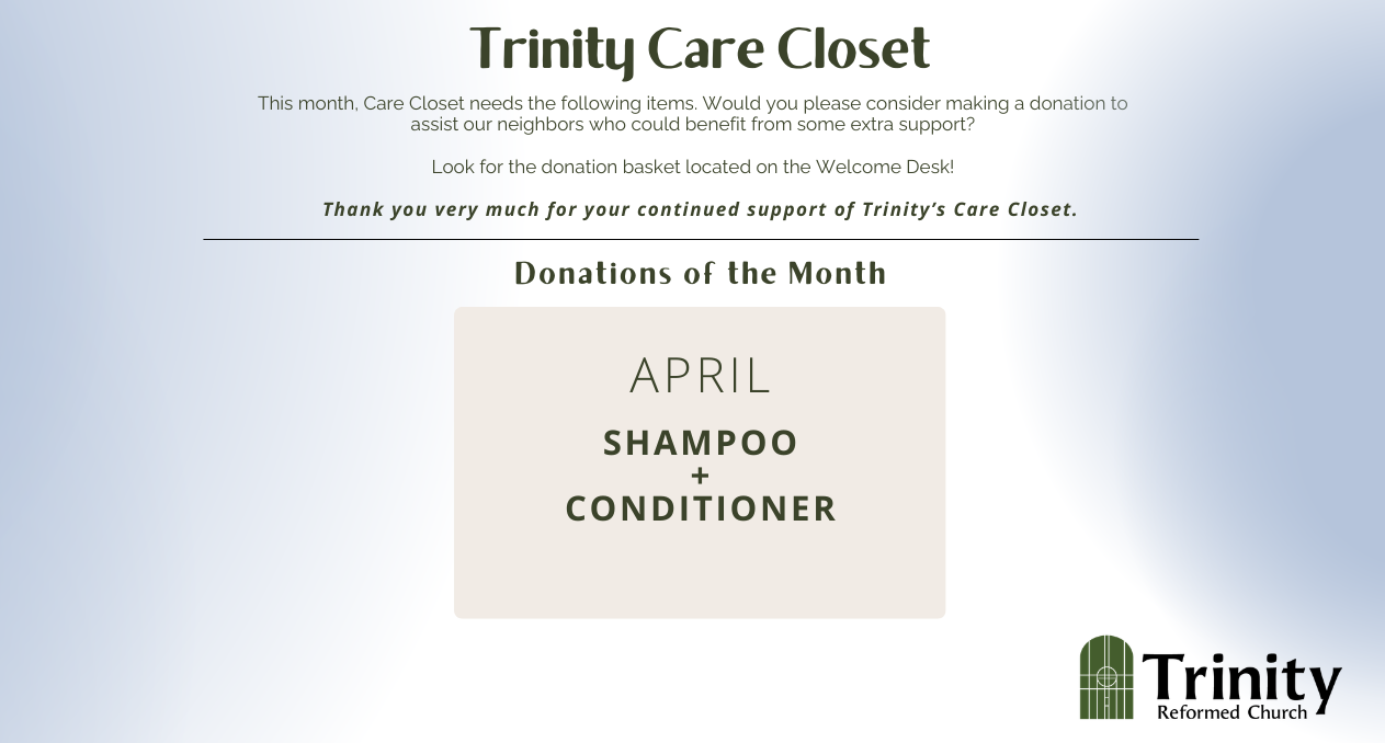 This month we are looking for donations of shampoo and conditioner. Drop them in the basket on the Welcome Desk or bring t...